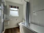 Bathroom - Modern white suite of panelled bath with shower guard and mixer taps and independent shower fitting. Washbasin with mixer tap and mirrored cabinet over. Low-level WC. Chromium towel rail.