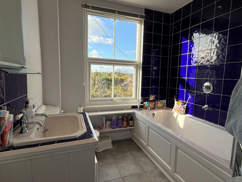 A white suite of panelled bath with pull-out shower attachment and overhead shower. Low-level WC. Washbasin with cupboard beneath. Heated chrome towel rail. Views towards Steyning High Street.