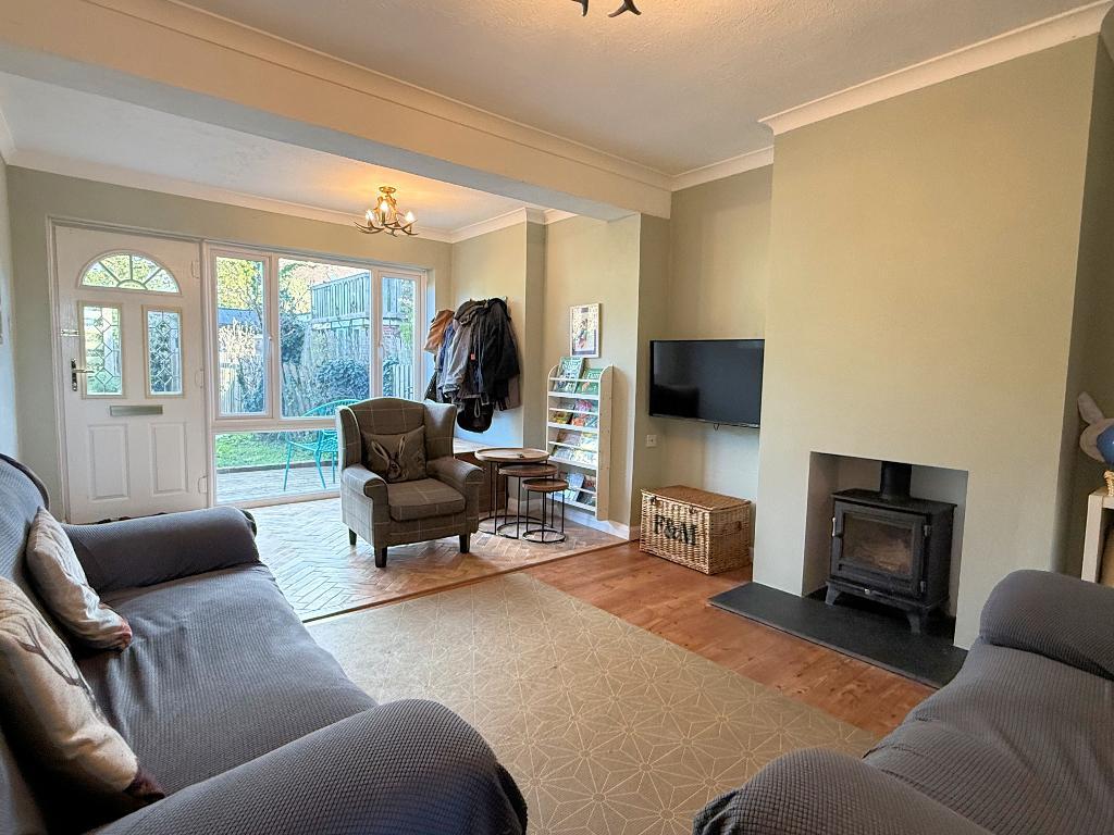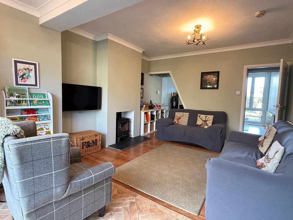 Sitting Room - 17'6" x 10'7" (5.33m x 3.23m) Part herringbone-patterned floor. Part exposed floorboards. Log-burning stove with slate hearth.