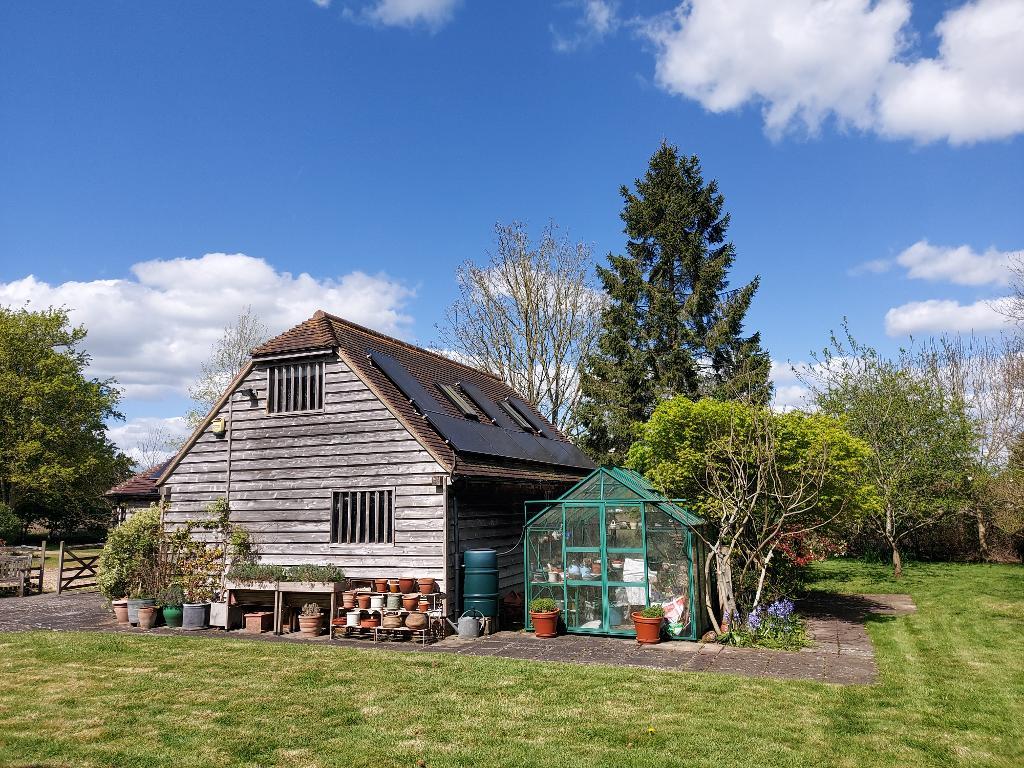 Comprising Double Carport: 17'0" x 17'5" (5.45m x 5.32m) with EV charger point, oak-framed, power connected, mezzanine storage area. Photovoltaic cells on two roof slopes.