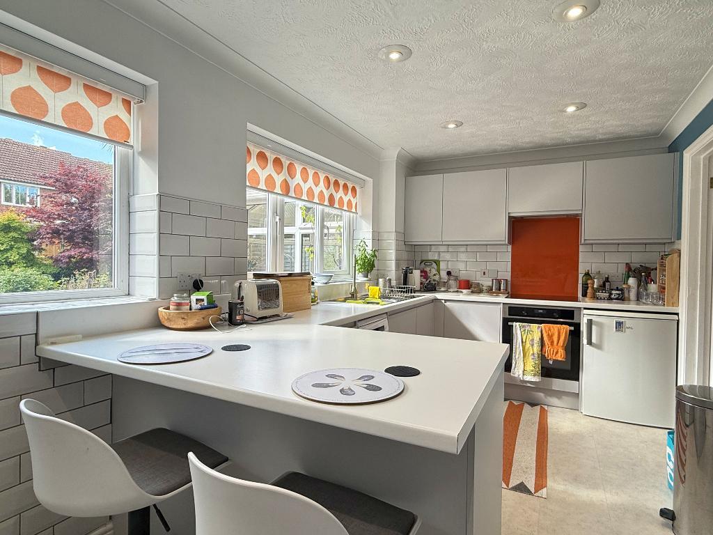 Kitchen - 17'4" x 8'1" (5.29m x 2.47m) Refitted with light grey units and roll edge work surfaces. Inset one and a half bowl stainless steel sink unit. Adjoining work surfaces. Range of base cupboards and drawers, including pan drawers. Corner carousel. Space for fridge. Inset ceramic hob with oven/grill below and filter hood above. Space and plumbing for slimline dishwasher. Breakfast bar. Further matching work surface to back wall with cupboards and drawers. Wall-mounted cupboards, one housing the Worcester gas-fired boiler (installed in June 2025). Part-tiled walls. Two double-glazed windows and double-glazed door leading onto the rear garden. Radiator. Down-lighters. Door leading to the integral garage.