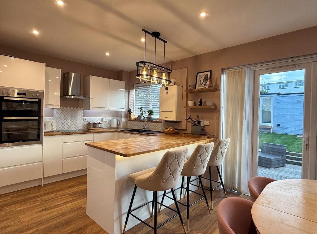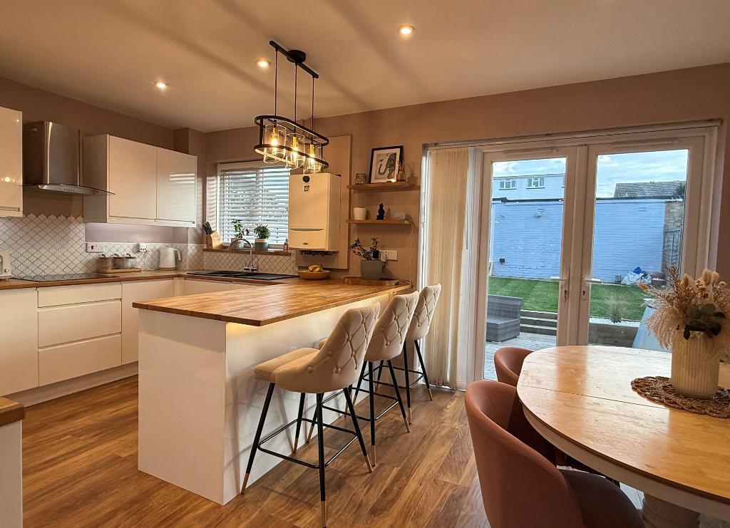 Kitchen/Dining Room - 16'8" x 11'5" (5.09m x 3.49m) Space for table and chairs. PVCu French doors leading onto the rear garden. Kitchen with white gloss units and solid wood worksurfaces with inset single-drainer one-and-a-half bowl sink unit. Good range of base cupboards and drawers. Space and plumbing for washing machine. Integrated dishwasher. Ceramic hob with filter-hood over. Double oven/grill. Wall-mounted cupboards. Wall-mounted Alpha gas-fired combination boiler. Under stairs storage cupboard. Space for fridge/freezer. Larder cupboard. Downlighters.