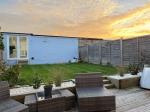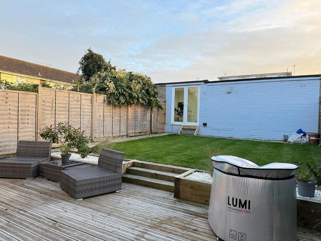 Rear Garden - Decking area. Raised flower beds. Area of lawn. Pathway. Outside water supply and power. PVCu double-glazed doors to Home Office.