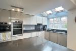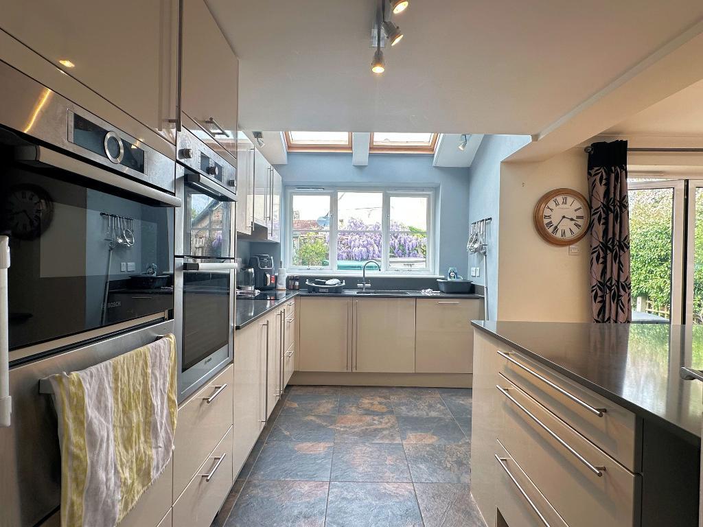 Kitchen/Dining Room - 20'10" x 14'4" (6.34m x 4.38m) With roof lantern and double-glazed bi-folding doors leading onto the rear garden. Modern kitchen with gloss units and marble effect work surfaces, inset single drainer one and a half bowl sink unit. Good range of base cupboards, drawers and wall-mounted cupboards. Integrated Bosch dishwasher. Induction hob with filter hood over. Bosch double oven with drawers below. Combination microwave with warming drawer under. Space for fridge/freezer. Two Velux windows. Under floor heating. Tiled flooring in the kitchen area. Door to: