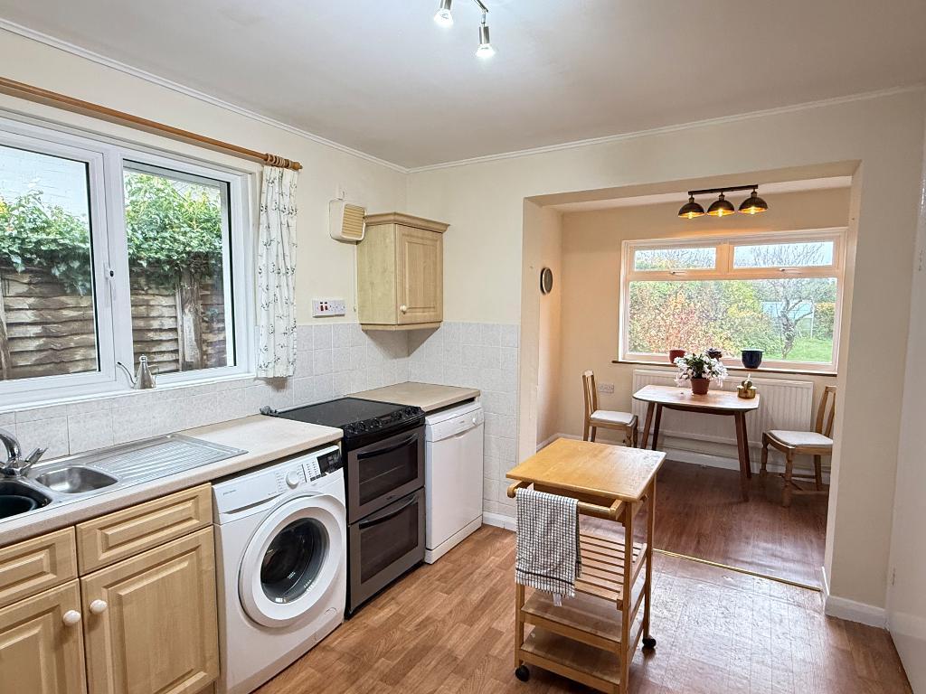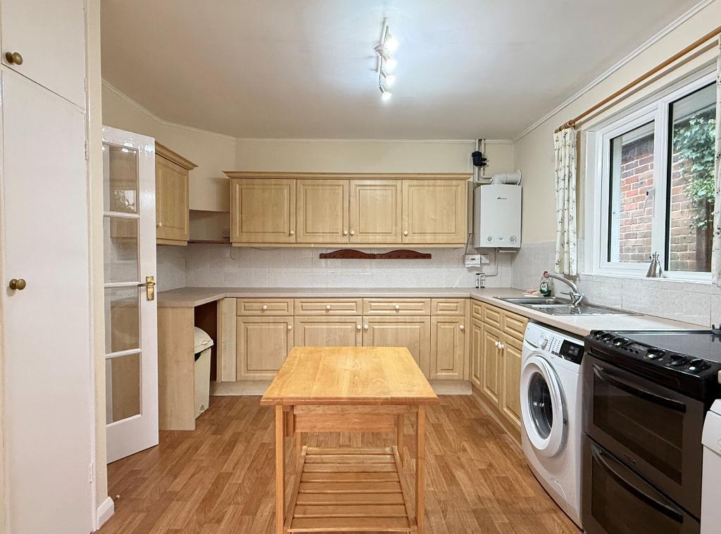 Kitchen/Breakfast Room - 19'1" x 10'11" (5.82m x 3.34m) Double aspect. Single-drainer one-and-a-half bowl sink unit set into working surface with cupboards below. Space and plumbing for washing machine. Space for cooker. Adjoining work surfaces. Space and plumbing for dishwasher. Further base cupboards and drawers. Wall-mounted cupboards. Wall-mounted Worcester gas-fired boiler. Two adjoining shelved cupboards with storage above. PVCu double-glazed side and rear windows. Double-glazed door leading to the side.