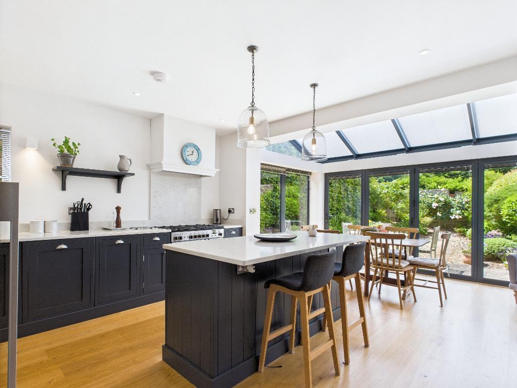 Open-Plan Kitchen/Day Room - 20'7" x 17'10" (6.28m x 5.46m) A light and spacious room with part-vaulted glazed ceiling and full-width bi-fold doors overlooking and opening to the secluded rear garden. A high specification kitchen with polished stone work surfaces and contrasting base units with cupboards and drawers and integrated bin store and dishwasher. Inset one and a half bowl sink fitting. Range Master five-ring oven with concealed filter hood over. Central island with cutlery drawer and deep drawers and breakfast bar. Further unit with central space for fridge/freezer. Matching dresser unit with cupboards and drawers and shelving above.