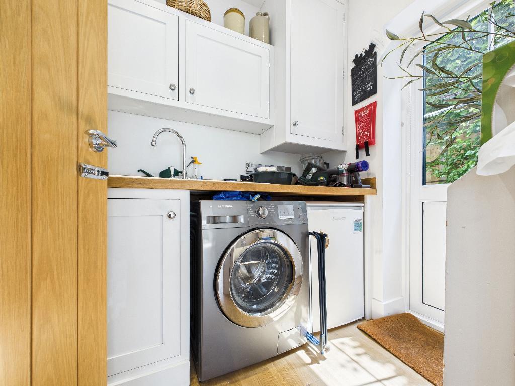 6'3" x 5'2" (1.93m x 1.59m) Sink unit with mixer tap and cupboard beneath and space and plumbing for washing machine. Cupboard housing gas-fired boiler providing hot water and central heating. Door to side access.