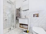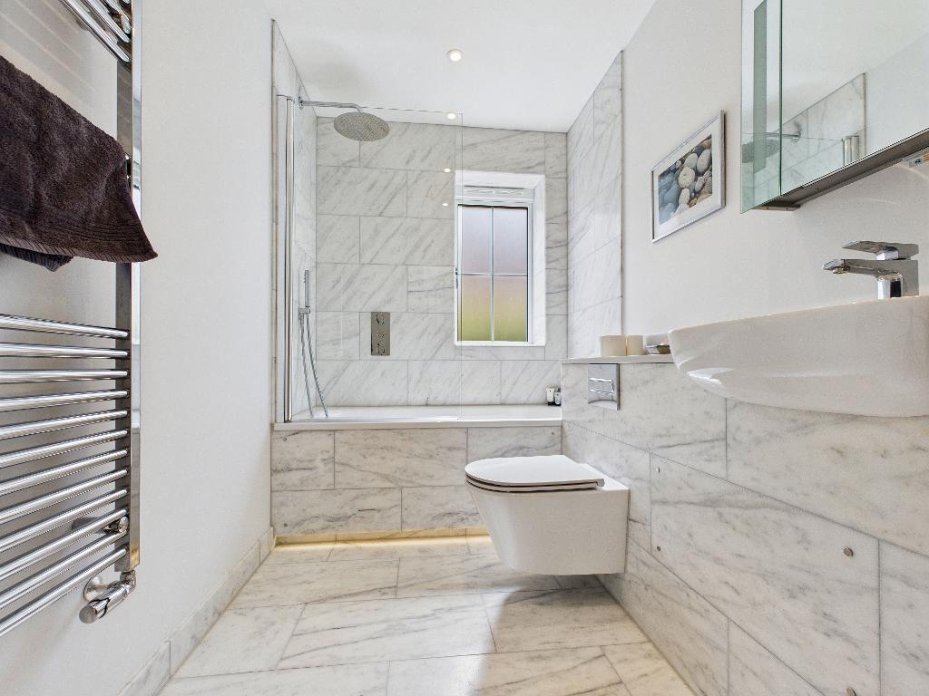 White suite of panelled bath with glazed shower guard, drench head and hand shower. Washbasin with mixer tap. WC with concealed cistern. Chromium towel rail. Matching floor and wall tiles.