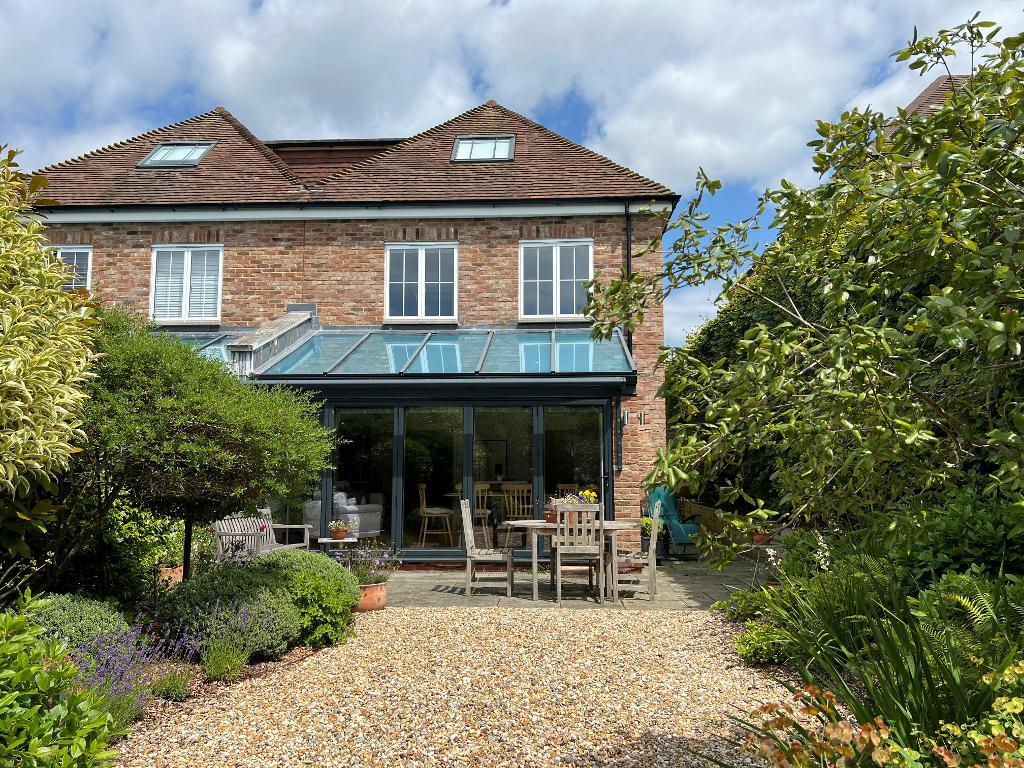 An attractive semi-detached house, one of four architect-designed homes, built some seven years ago to a high specification and of conventional construction with flint elevations under a pitched and tiled roof. The accommodation is arranged over three storeys, and a particular feature is the open-plan kitchen/day room with bifold doors to the landscaped garden. The internal specification is very high, with oak internal doors, oak flooring to the ground floor, and quality sanitary-ware. This is an efficient, modern home with an EPC rating B. Windows are double glazed and there is gas-fired central heating with underfloor heating to the ground floor.