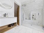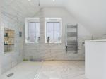 En-suite Shower Room - Large shower area with drench head and hand shower. Fitted shelving. Contemporary washbasin. WC with concealed cistern. Towel rail. Matching floor and wall tiles.