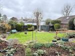 Rear Garden - Patio area. Ornamental pond. Side access path with wrought-iron gates to both sides. Lawned area with raised borders with flower and shrubs.