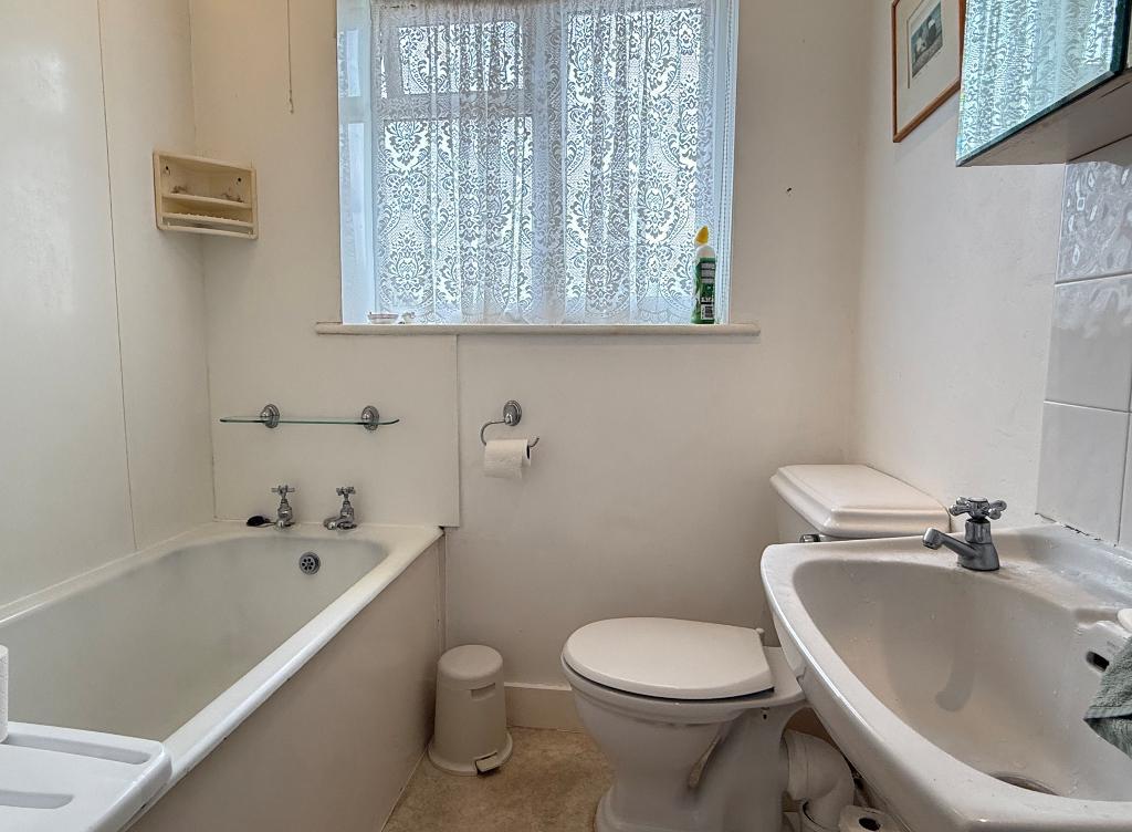 Bathroom - White suite of panelled bath with independent shower head over. Pedestal wash basin, WC, radiator, shelved linen cupboard, recessed ceiling lighting.