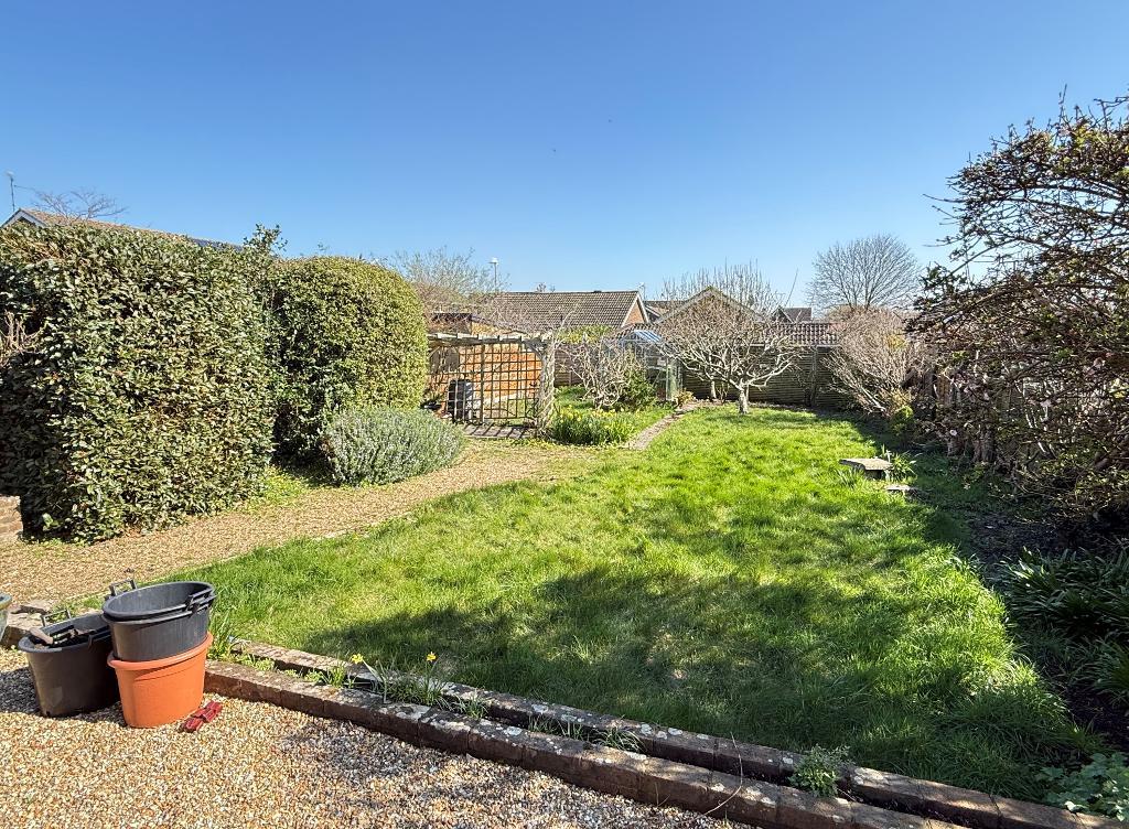 Rear Garden - Approximately 75ft (23m) in depth enclosed by fencing with shingle area to the rear of the house and steps down to gravelled seating area with timber pergola and shaped lawn with mature shrub and flower borders, vegetable garden, aluminium greenhouse, water tap.