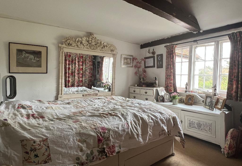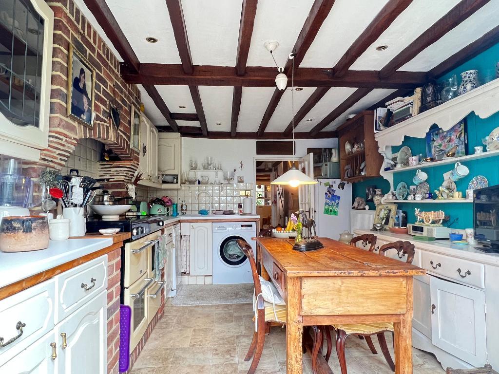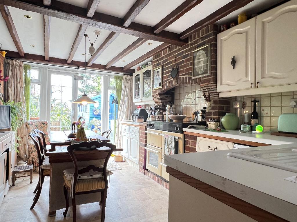 Kitchen/Diner - 15'7" x 10'2" (4.76m x 3.11m) French doors and windows overlooking and opening to the garden. Attractive cottage kitchen with exposed ceiling timbers and feature chimney breast with space for range cooker. Ample space for breakfast table. Selection of Formica worktops with inset sink unit. Space for appliances. Cupboards and drawers. Double radiator.