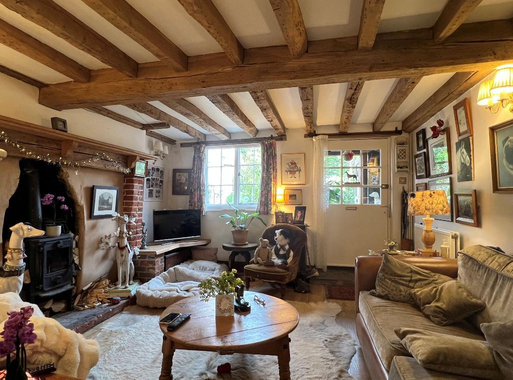 Sitting Room - 13'9"x 11'10" (4.18m x 3.60m) Exposed honey-coloured ceiling timbers. Attractive fireplace with timber mantel, brick hearth and fitted wood-burning stove, with oak shelving to either side. Two double radiators. Secondary glazing to windows.