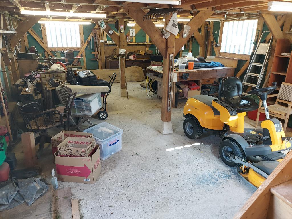 Workshop Section: 29'10" x 17'8" (9.11m x 5.39m) Oak-framed with timber piers. Strip lighting and power.