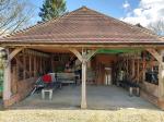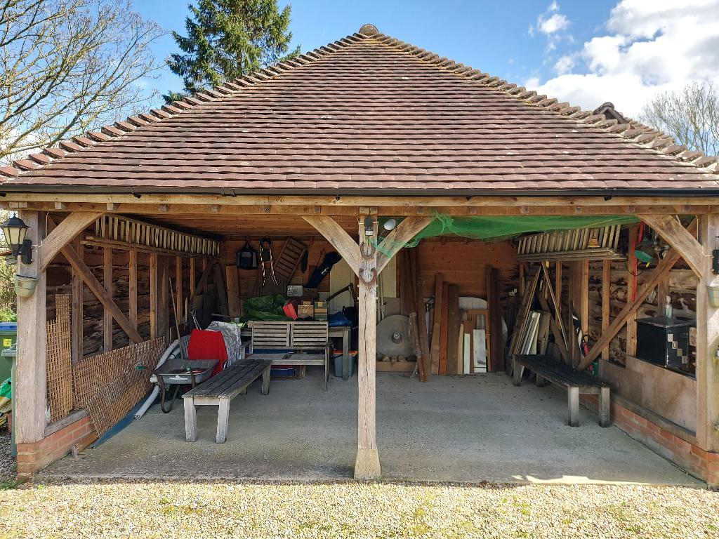 Comprising Double Carport: 17'0" x 17'5" (5.45m x 5.32m) with EV charger point, oak-framed, power connected, mezzanine storage area. Photovoltaic cells on two roof slopes.