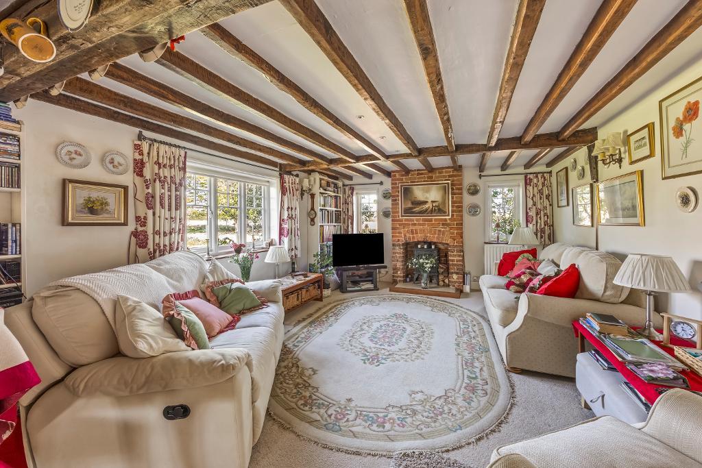 Open-Plan Living Space - 44'10" x 16'2" (12.44m x 4.93m) Triple aspect and overlooking the gardens with a wealth of exposed timbering. The central feature is a fine Inglenook fireplace with stout timber bressumer and fitted wood-burning stove on raised tiled hearth and flanked by the sitting area with exposed brick fireplace and fitted wood burner and dining section (double aspect).