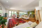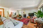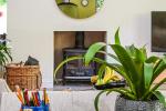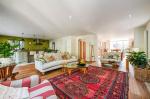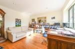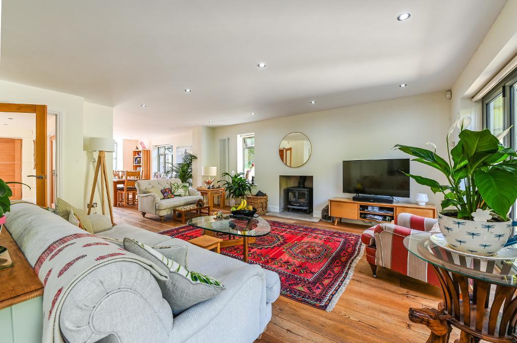 Sitting Room: Oak plank flooring and natural stone flooring continuing through to kitchen area. Pair of wide bi-fold doors to sun terrace. Wood-burning stove.