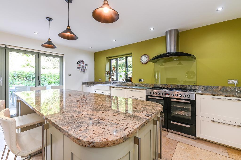 Kitchen Area: Comprehensively fitted with polished granite work surfaces and excellent range of base cupboards, drawers and pan drawers. Double ceramic sink with flexible mixer tap and integrated waste bin beneath. Integrated dishwasher. Five-ring range double oven with extractor hood over. Integrated refrigerator. Larder cupboard. Integrated freezer. Large island unit with range of cupboards.
