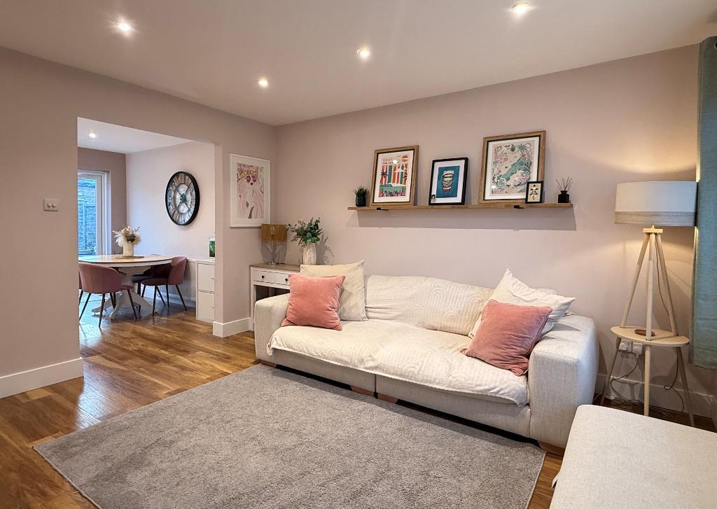 Kitchen/Dining Room - 16'8" x 11'5" (5.09m x 3.49m) Space for table and chairs. PVCu French doors leading onto the rear garden. Kitchen with white gloss units and solid wood worksurfaces with inset single-drainer one-and-a-half bowl sink unit. Good range of base cupboards and drawers. Space and plumbing for washing machine. Integrated dishwasher. Ceramic hob with filter-hood over. Double oven/grill. Wall-mounted cupboards. Wall-mounted Alpha gas-fired combination boiler. Under stairs storage cupboard. Space for fridge/freezer. Larder cupboard. Downlighters.