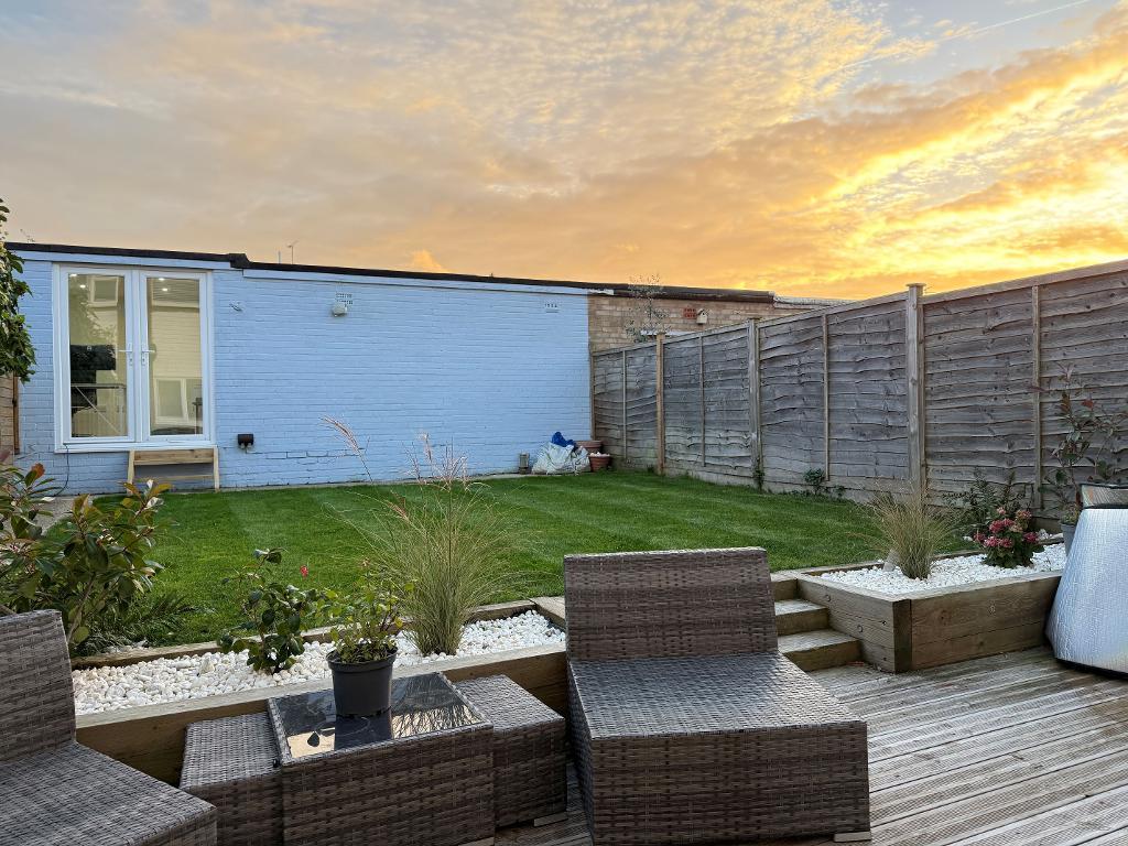 Rear Garden - Decking area. Raised flower beds. Area of lawn. Pathway. Outside water supply and power. PVCu double-glazed doors to Home Office.