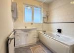 Bathroom - A white suite of panelled bath with electric shower over, and washbasin with cupboard and drawers beneath. Part-tiled walls. Shaver point.