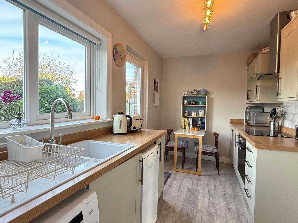 Kitchen - 13'4" x 7'2" (4.06m x 2.18m) With space for breakfast table. Window overlooking the rear garden. Good range of modern units with wood-effect work surfaces. Inset one and a half bowl Lamona sink unit with mixer tap and cupboards beneath. Space and plumbing for washing machine and slimline dishwasher. Further work surface with inset four-ring electric hob with tiled upstand and oven beneath and stainless-steel filter hood over. Fitted cupboards and drawers and matching wall units. PVCu door opening to the rear garden.