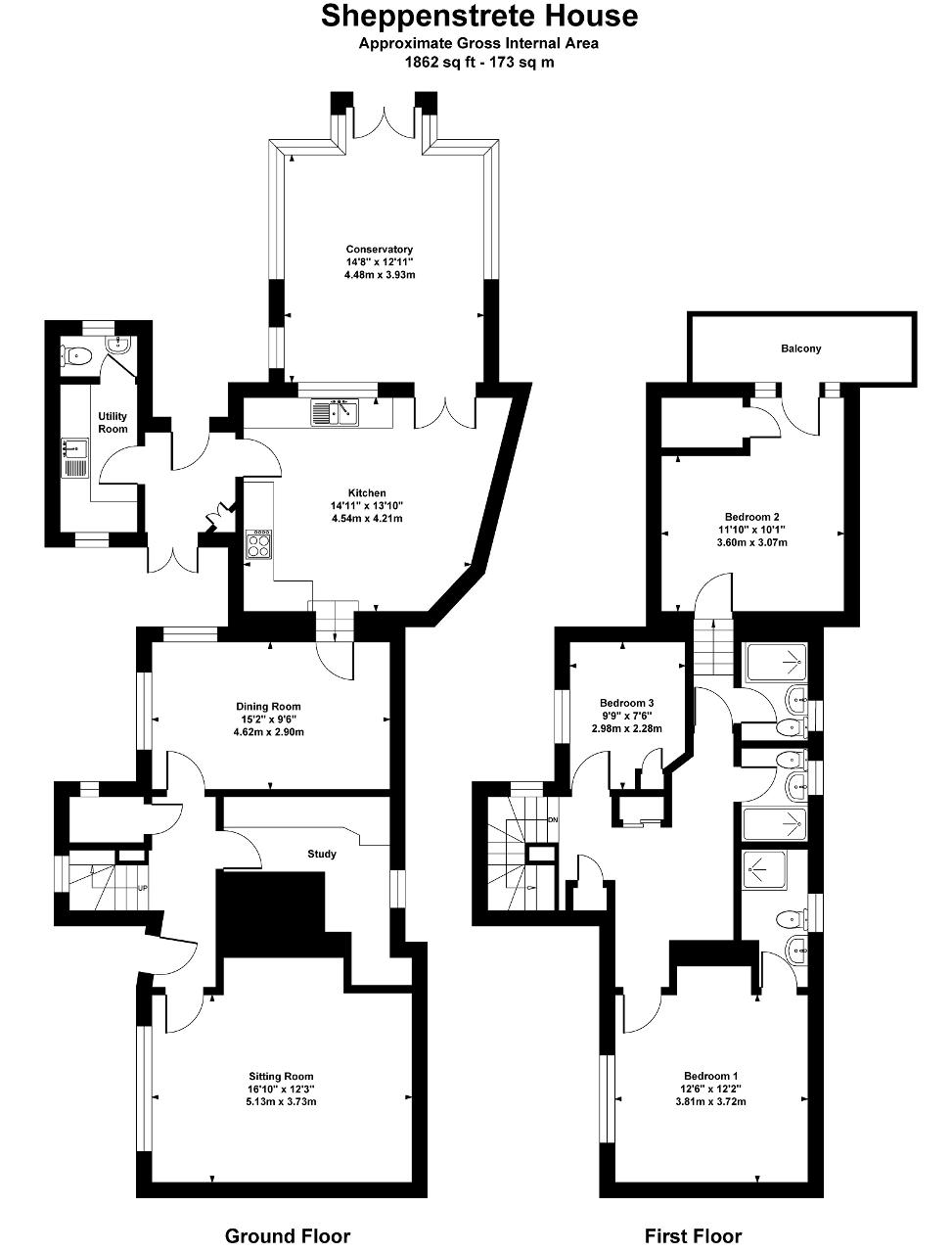 On the first floor there is a charming main suite with exposed timbering and en-suite shower room, and a further double bedroom and shower room as well as a French door to a small balcony enjoying roof-top views with the Downland skyline beyond. The third bedroom also accommodates a double bed and there is another separate family shower room.