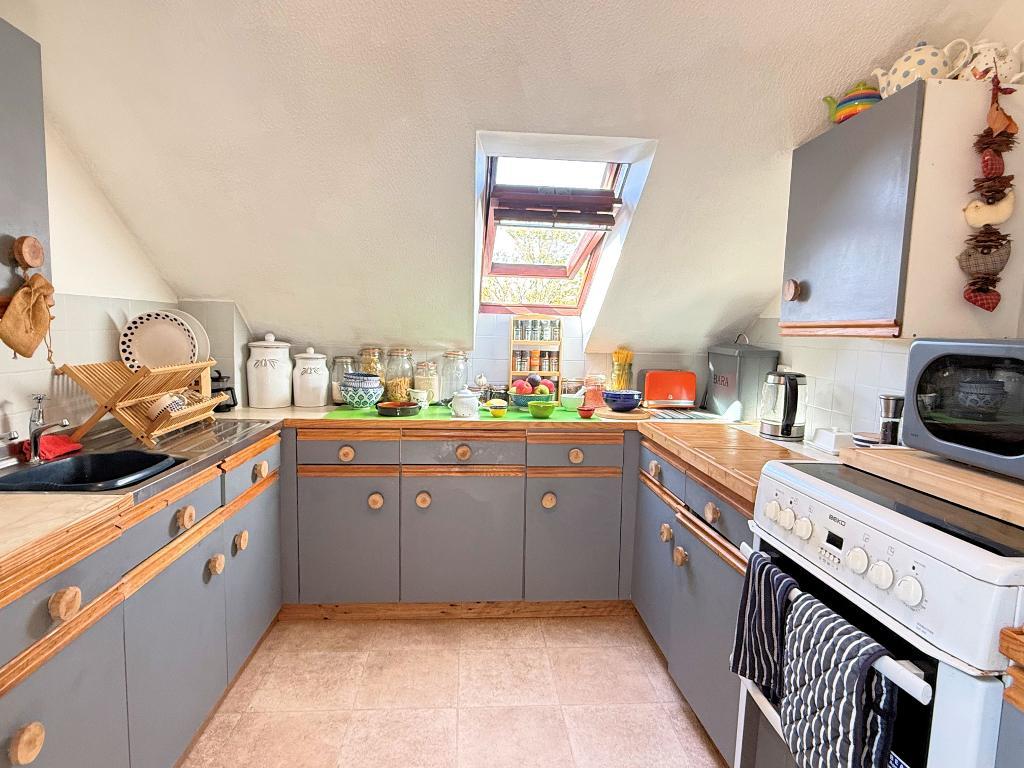Kitchen - 8'6" x 8'3" (2.6m x 2.51m) Good range of base cupboards and drawers and work surfaces. Inset single-drainer stainless steel sink unit. Space for cooker. Wall-mounted cupboard. Part-tiled walls. Velux window.